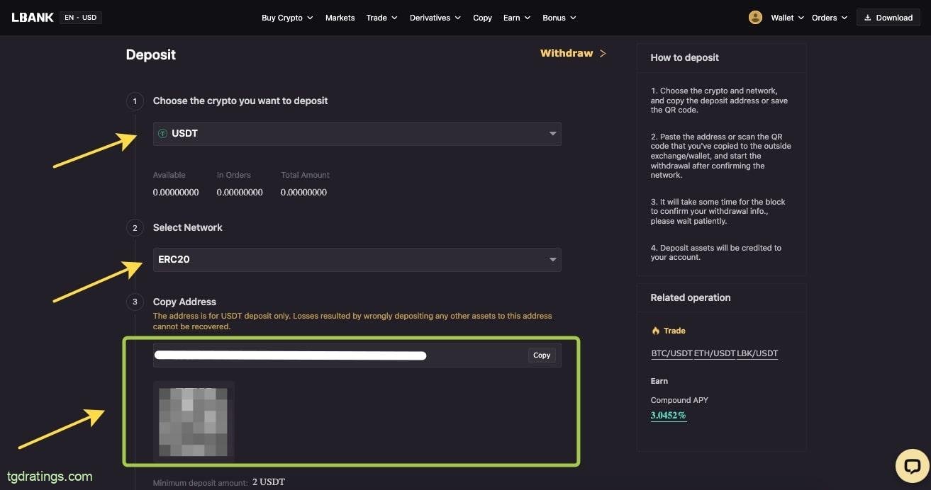 برای شروع ترید در LBANK، باید وجوهی را به حساب خود واریز کنید: