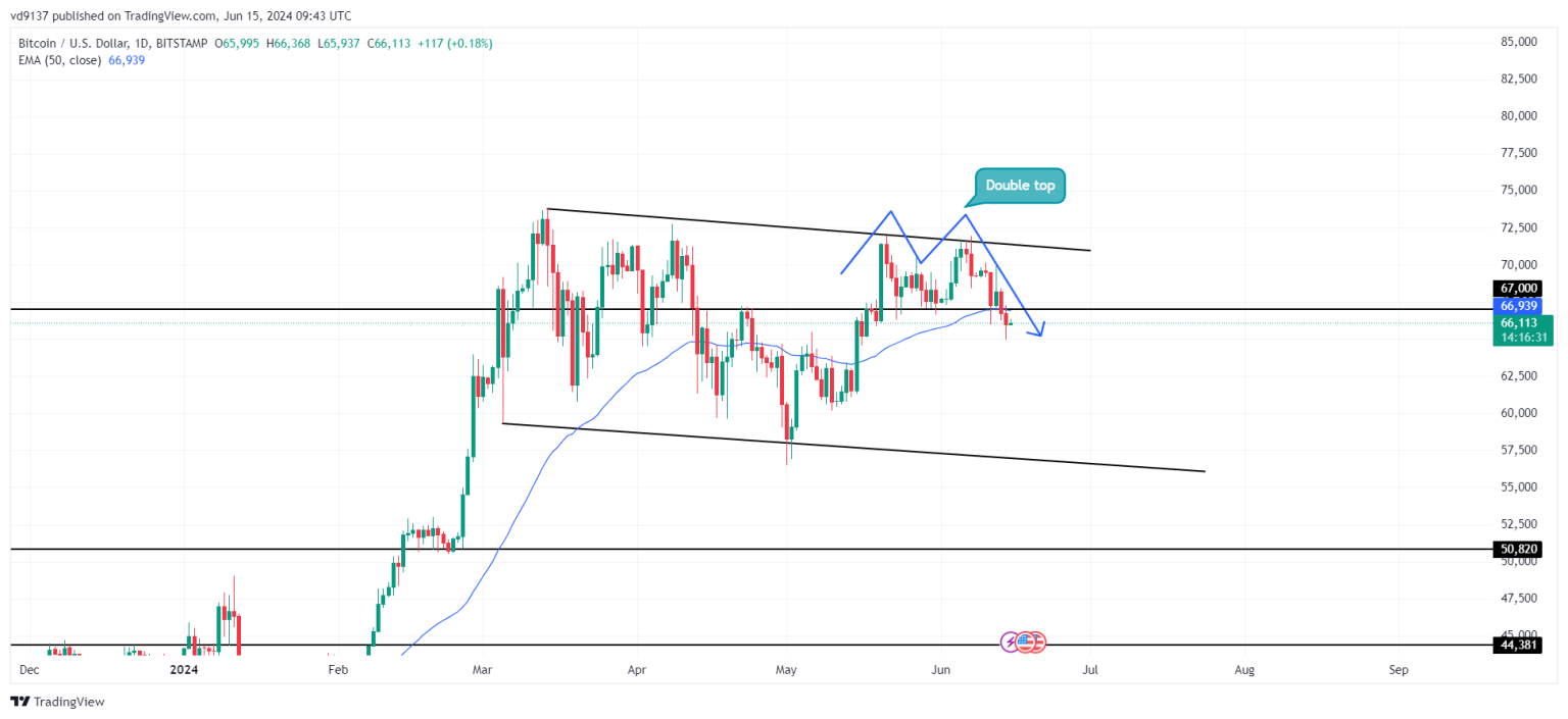تجزیه و تحلیل نمودار روزانه نشان می دهد که قیمت بیت کوین با استفاده از فشار عرضه در سقف 71000 دلار، یک الگوی نزولی دو طرفه ایجاد کرده است.