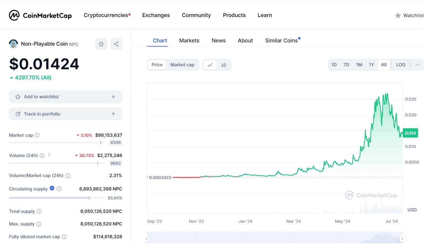 سکه غیرقابل بازی (NPC) در حال حاضر دارای ارزش بازار 114,674,385 دلاری است که آن را در رتبه 351 در CoinGecko قرار می دهد.