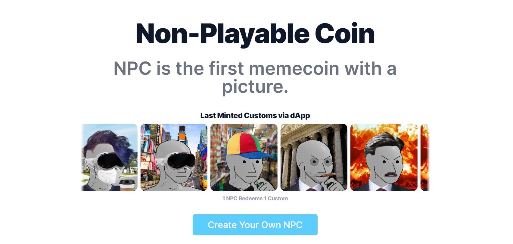 هر توکن NPC توسط یک NFT از این میم پشتیبانی می شود و با Transform dApp، کاربران می توانند به راحتی بین سکه و NFT 1:1 جابجا شوند.