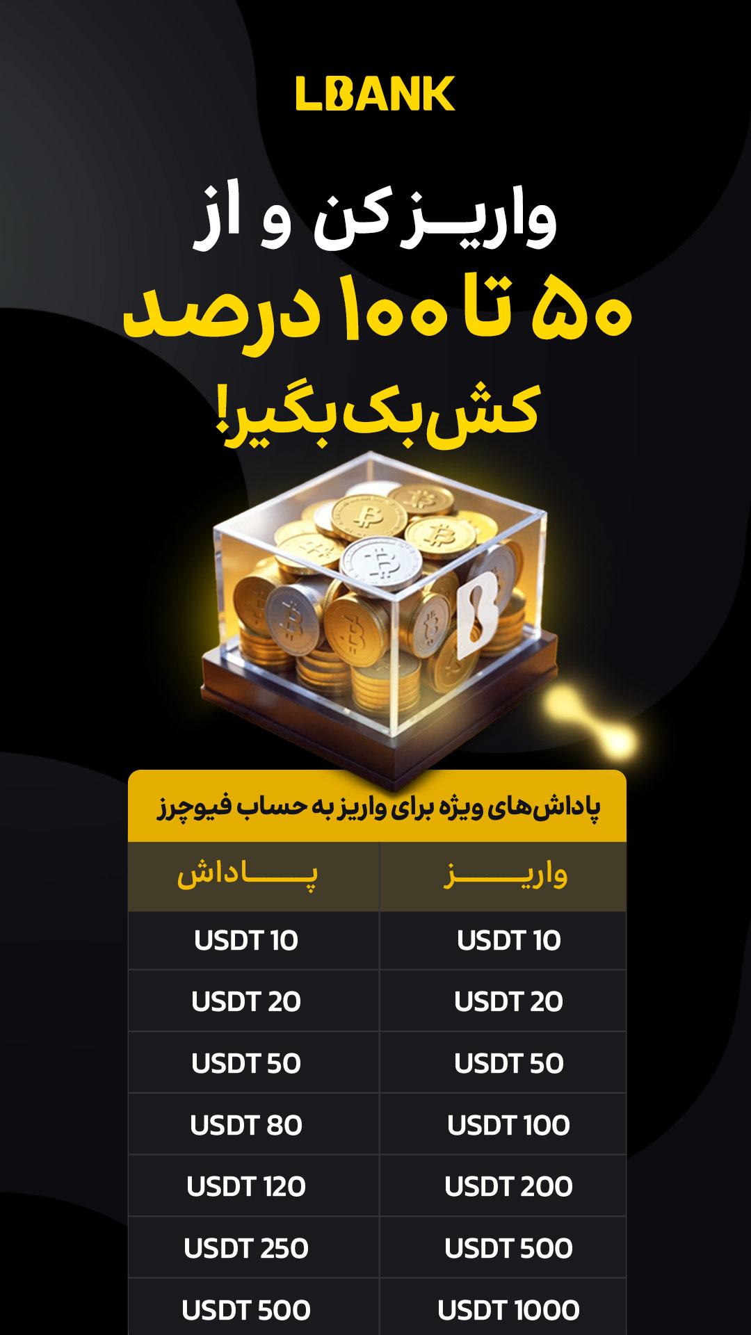 - دریافت کشبک بین 10 تا 500 USDT فقط با واریز به حساب فیوچرز.