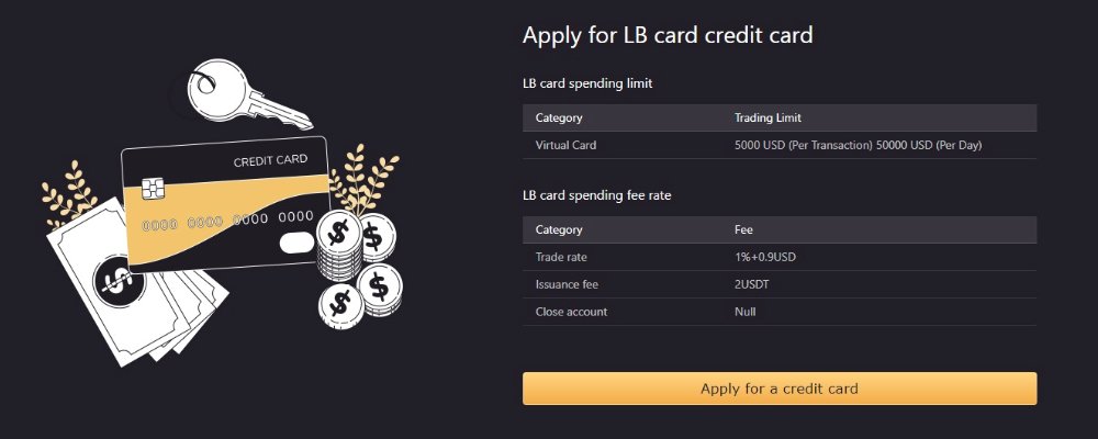 در حال حاضر، کارت LBank فقط بهصورت مجازی ارائه میشود. پس از عرضه کارت فیزیکی، کاربران میتوانند عملیات برداشت نقدی از خودپردازها را انجام دهند.